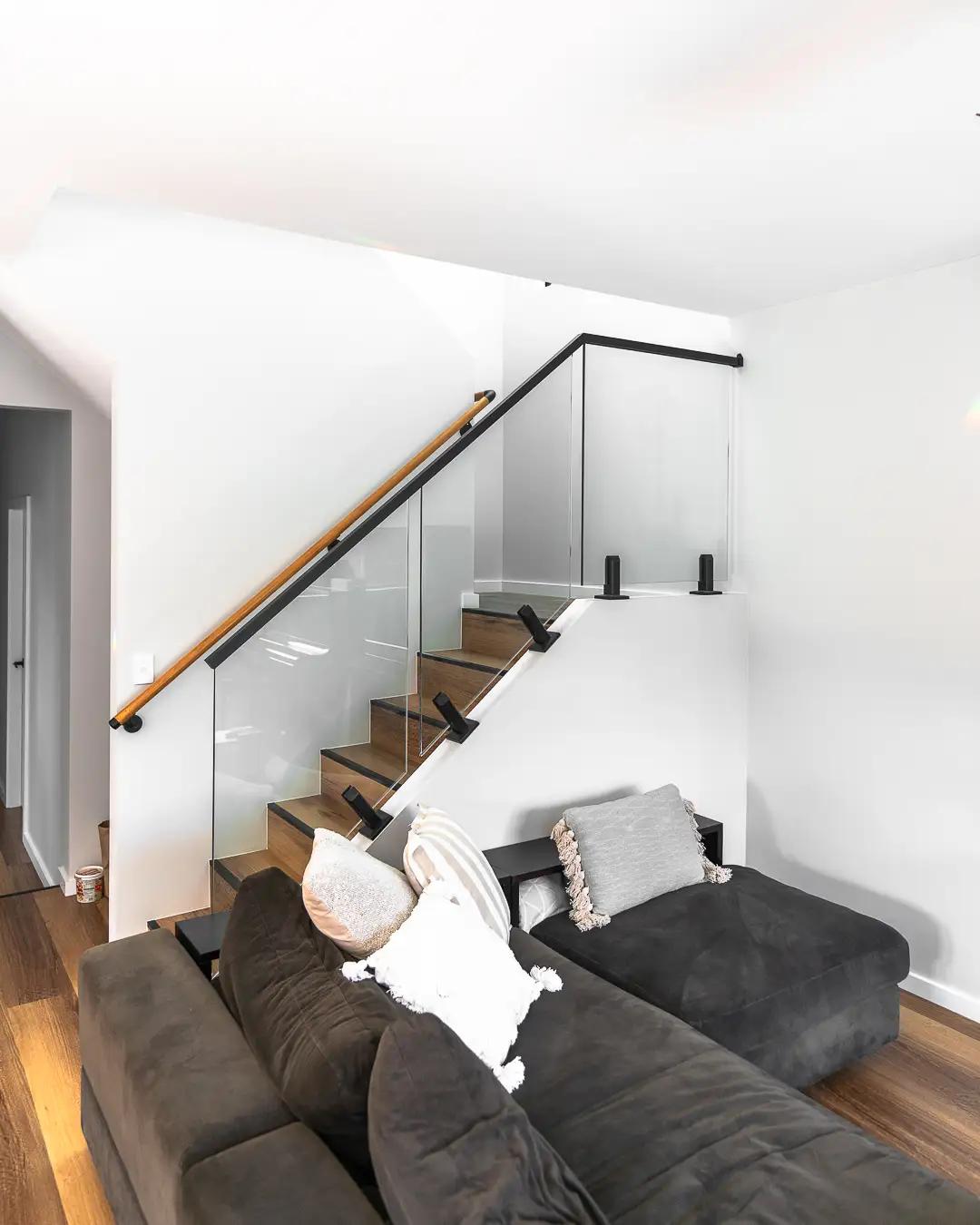 Clean lines and natural materials connect the living space to the upper level, with glass and timber working together to keep the area light and open