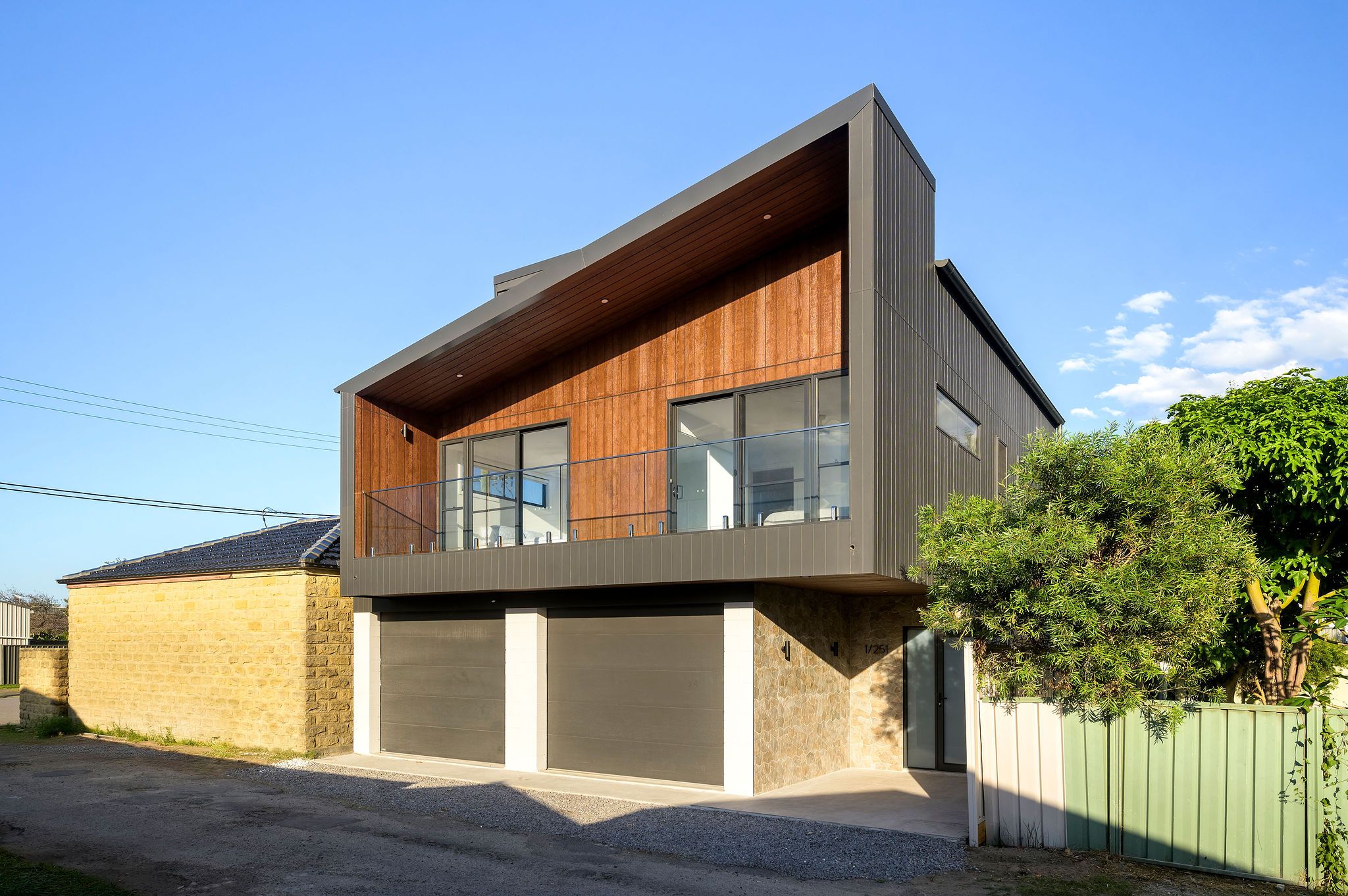 Bold contemporary design softened by natural timber and a thoughtfully landscaped entry